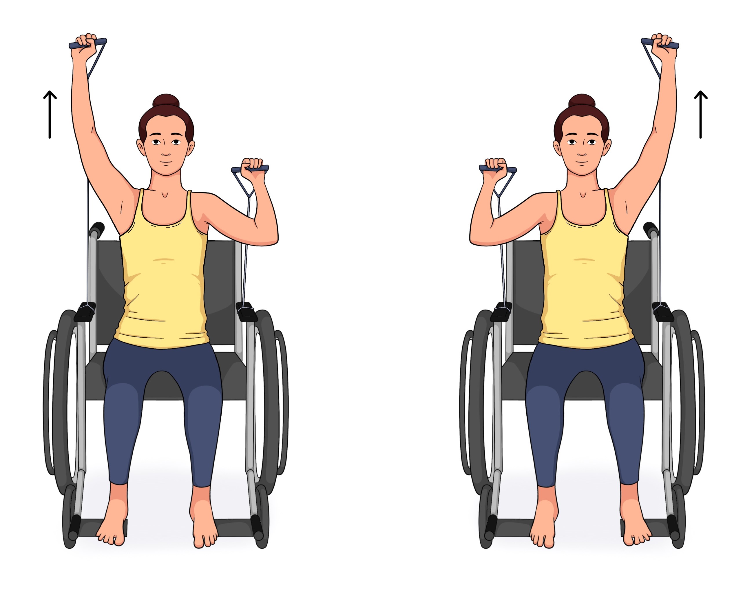 3) Eleve as mãos, como ilustra a figura, colocando mais tensão na banda. Mantenha a posição durante 2-3 segundos e retorne lentamente à posição inicial;