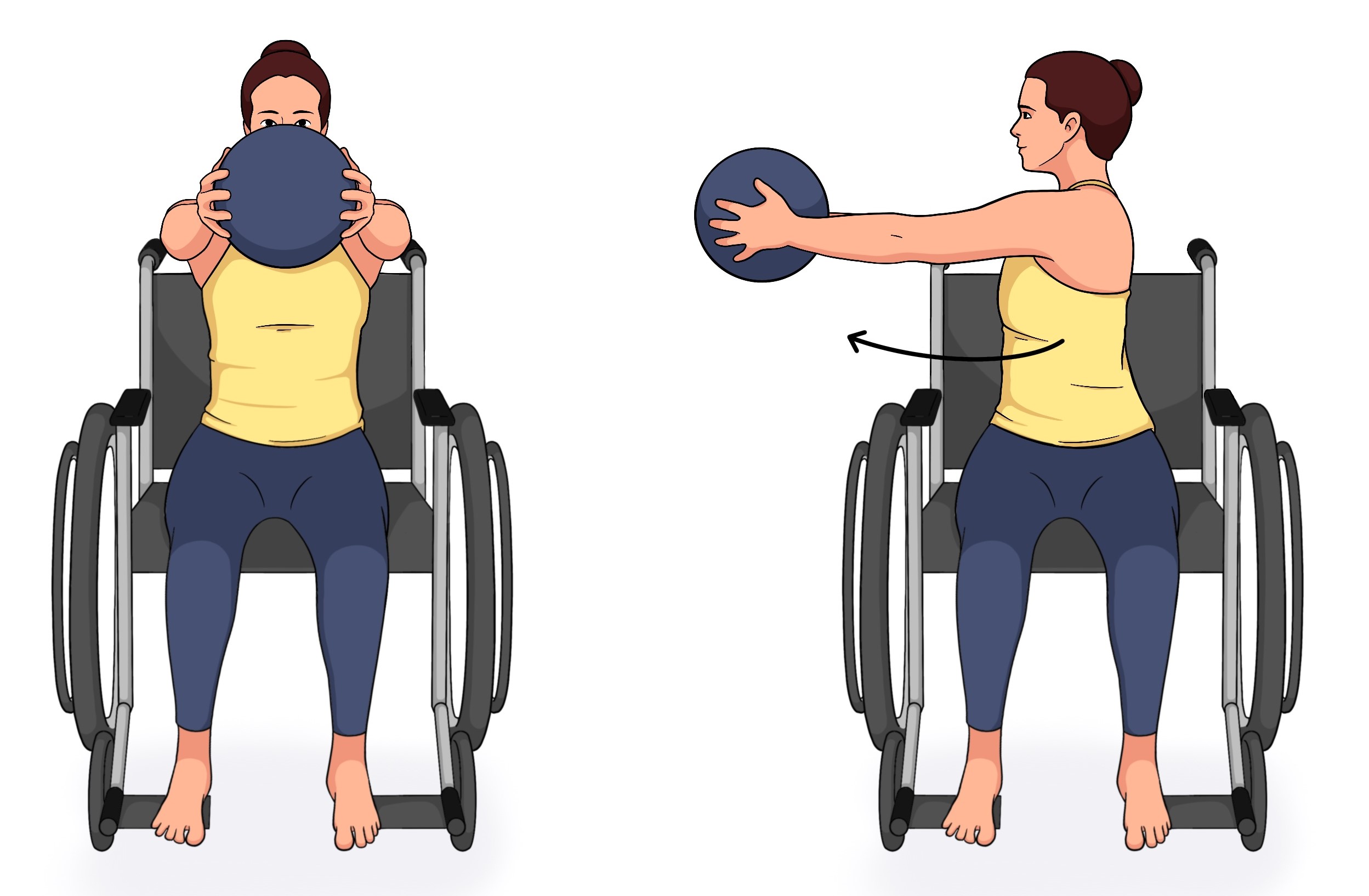 1) Sentado, segure numa bola medicional ou outro peso, com os braços estendidos à sua frente, como ilustra a figura;