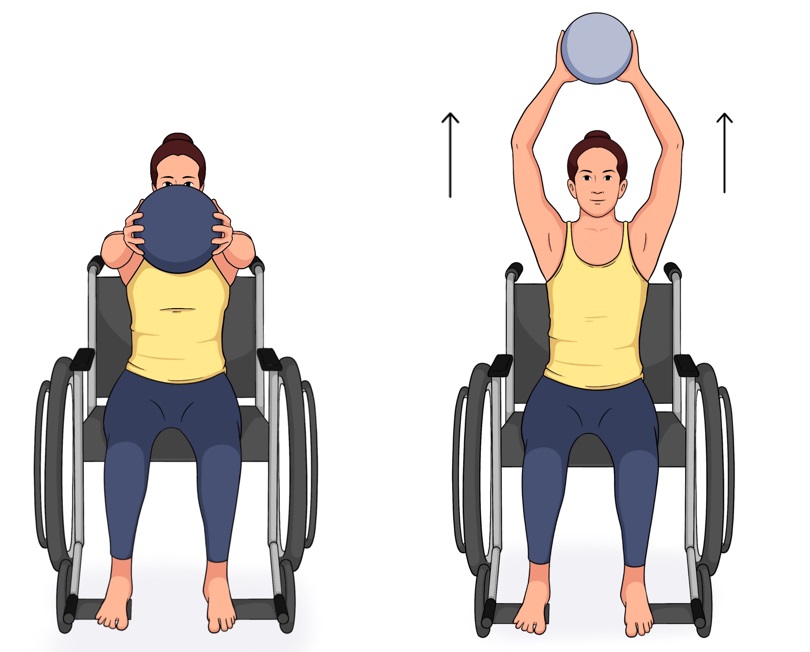 2) Levante a bola medicional acima do nivel da cabeça, com os braços estendidos, num movimento lento e controlado;