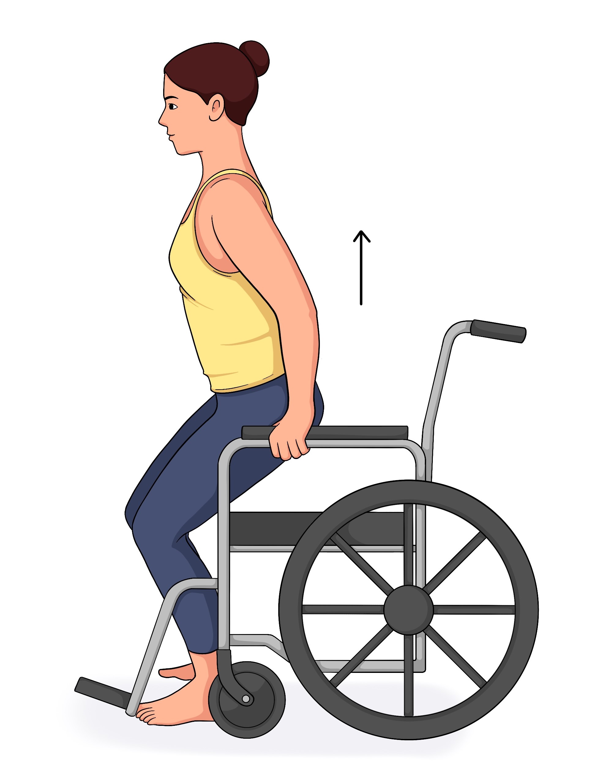 1) Sentado, mantendo as costas ligeiramente inclinadas para a frente, apoie-se com as mãos nos braços da cadeira, mantendo os cotovelos dobrados;