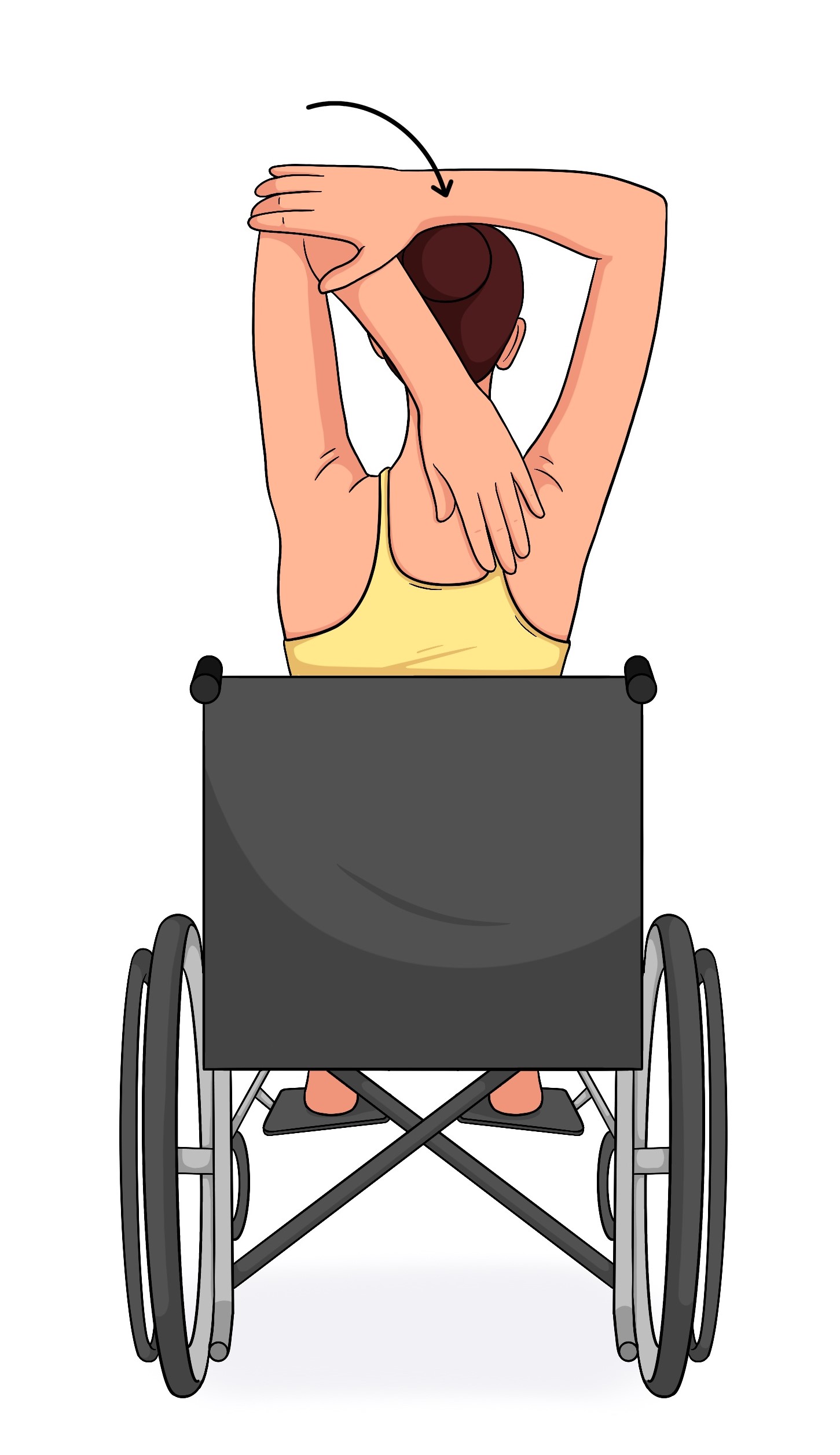 2) Com a outra mão, segura no cotovelo dobrado e puxe em direção à cabeça com uma leve pressão, até sentir um alongamento na região posterior do braço;