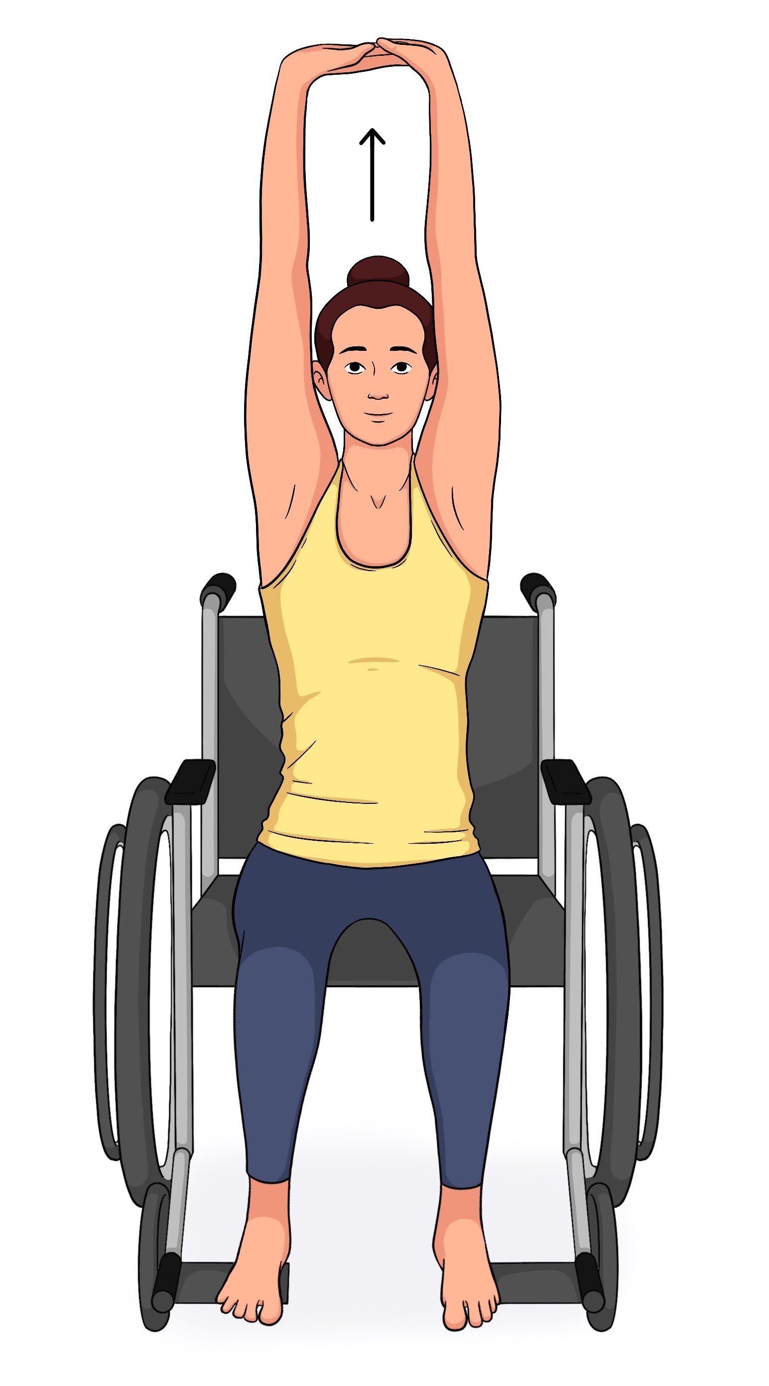 1) Sentado, estenda ambos os braços acima do nível da cabeça, entrelançando os dedos das mãos;