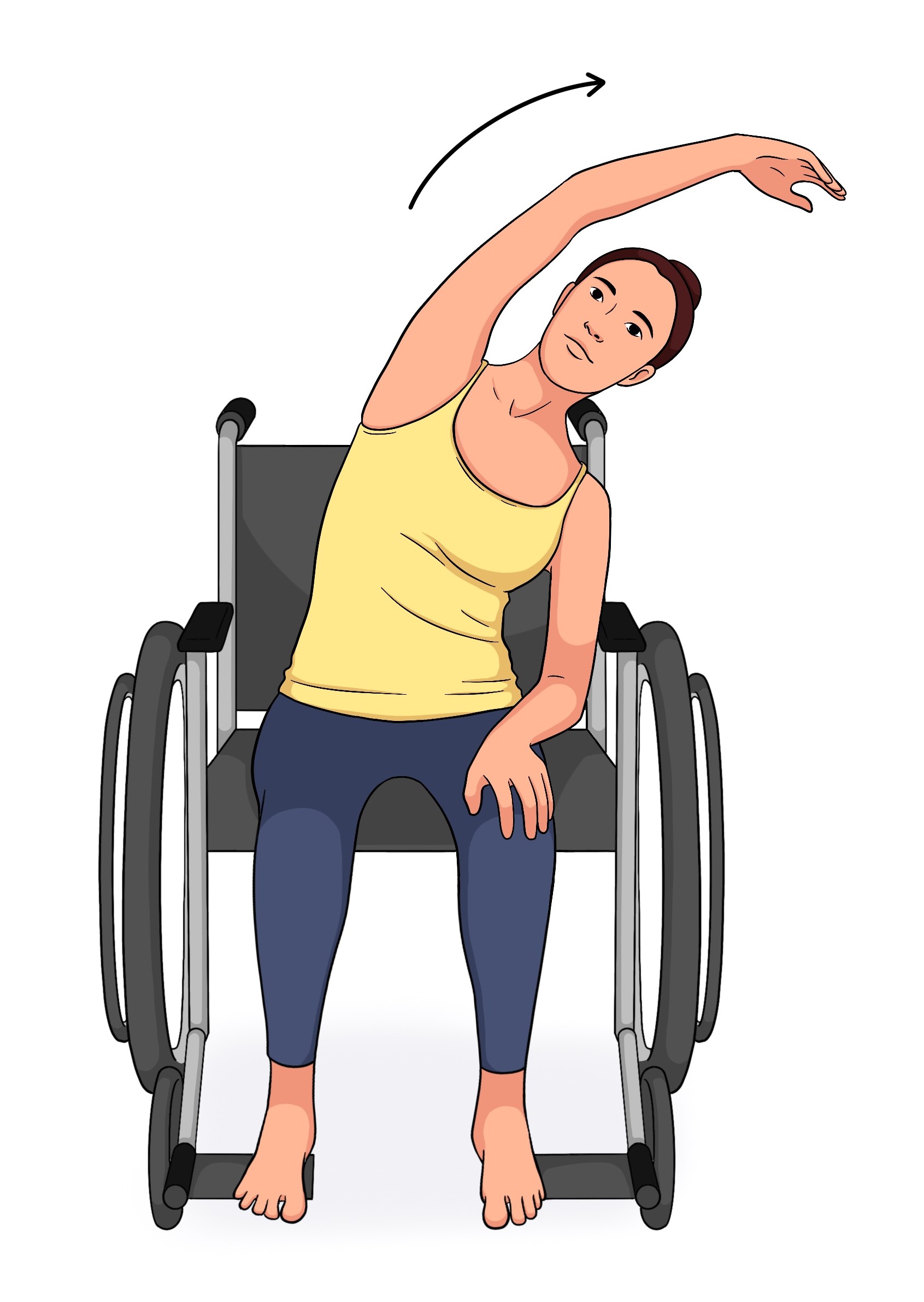 2) Com um movimento lento e controlado, incline o seu tronco para um lado, até sentir um alongamento no lado contralateral do tórax;