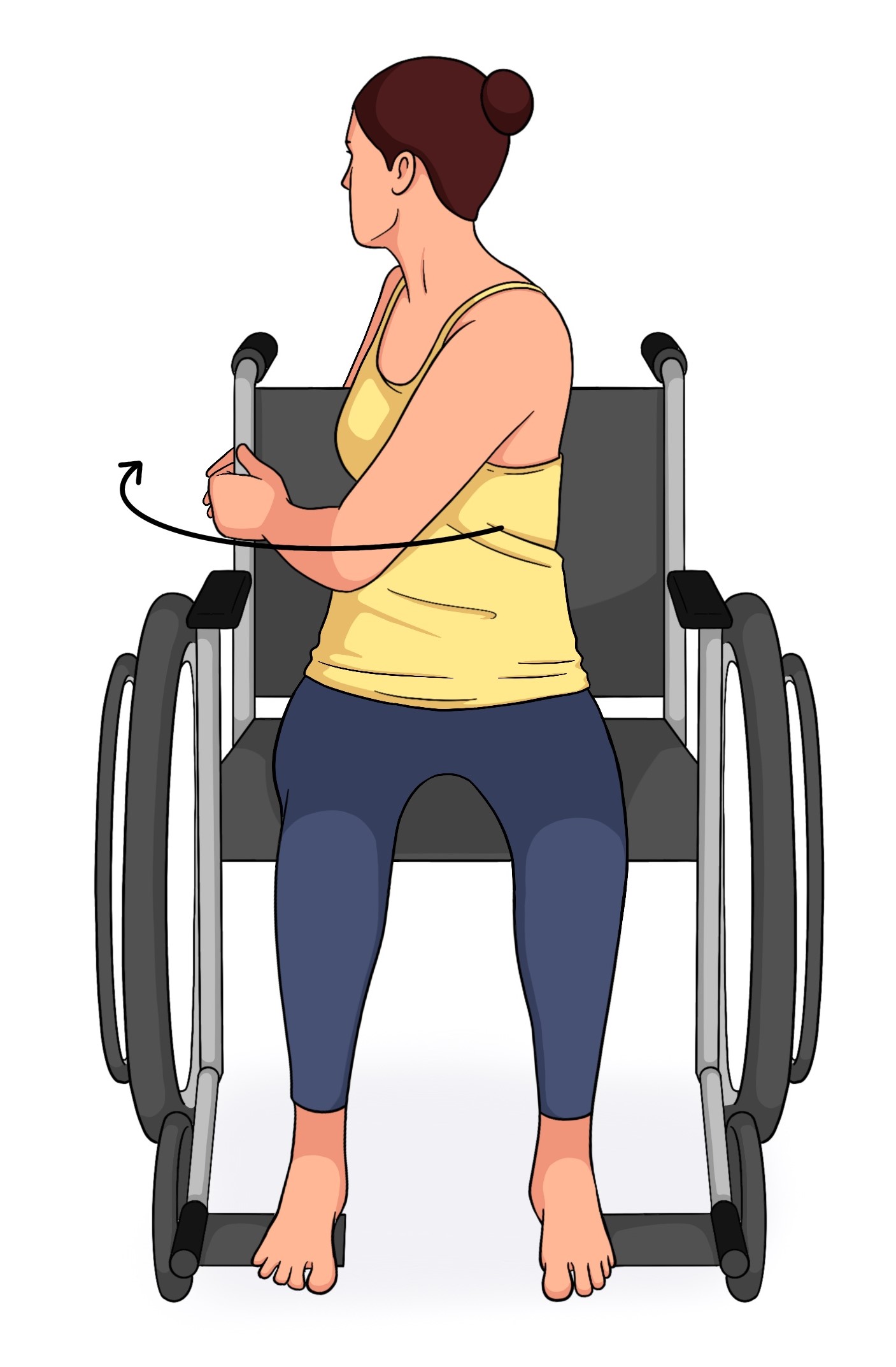 2) Rode a parte superior do tronco para um lado, até sentir um alongamento. (pode utilizar o encosto da cadeira para puxar e aumentar o alongamento, como ilustra a figura)