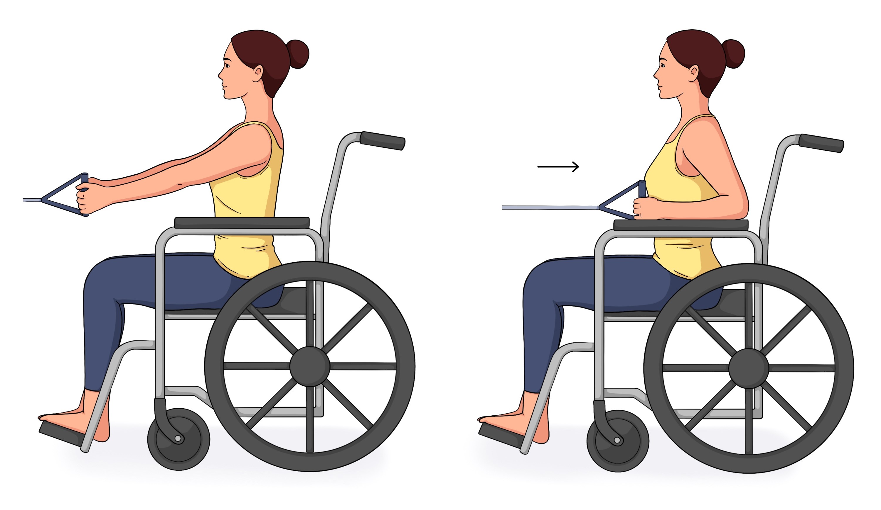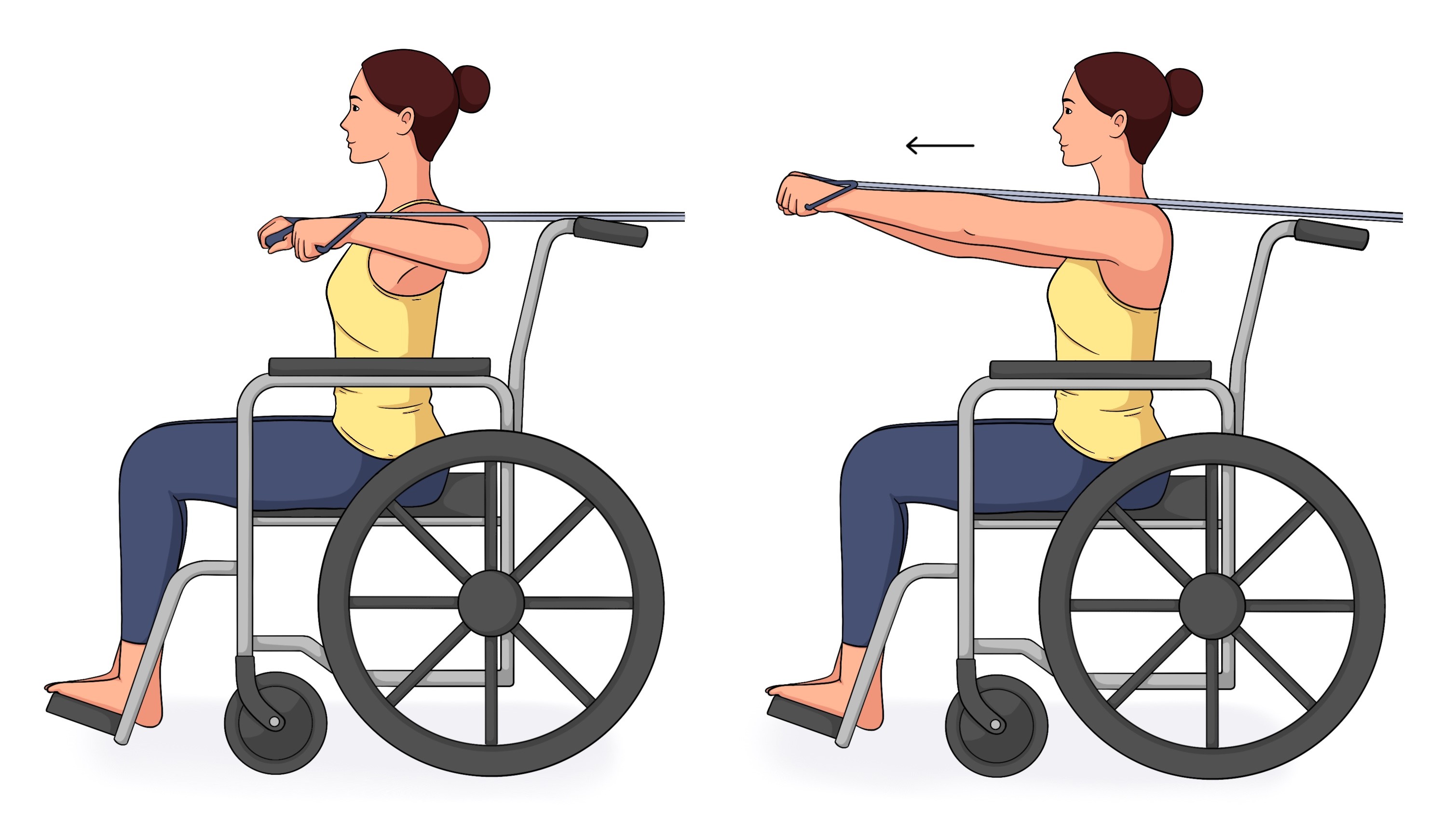 2) Coloque-se de costas para a banda elástica, empurre a banda com as mãos para a frente, estendendo completamente os braços, como ilustra a figura;