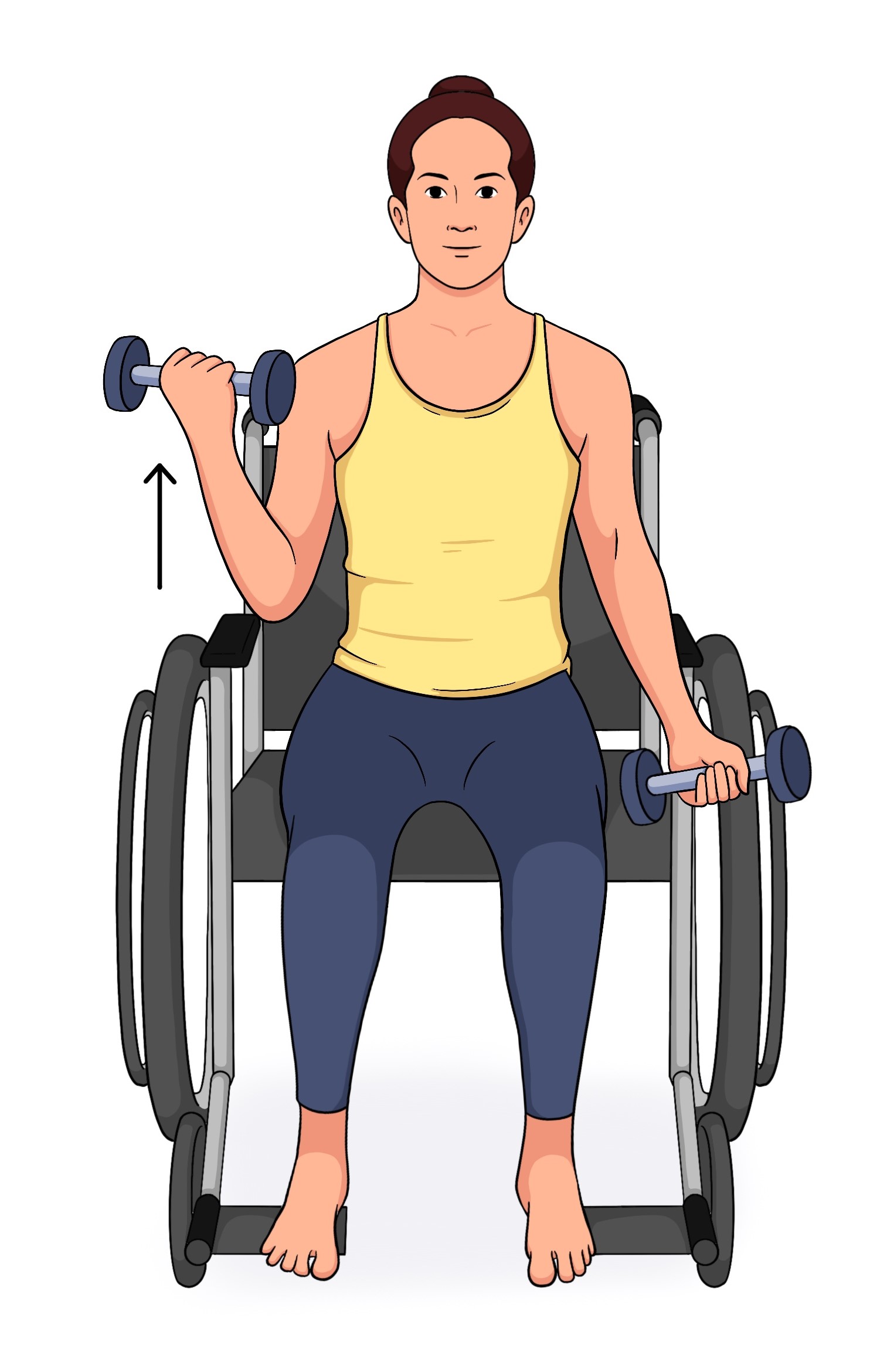 1) Inicie o exercício sentado, segurando num peso com a palma da mão voltada para cima, ao lado do tronco;